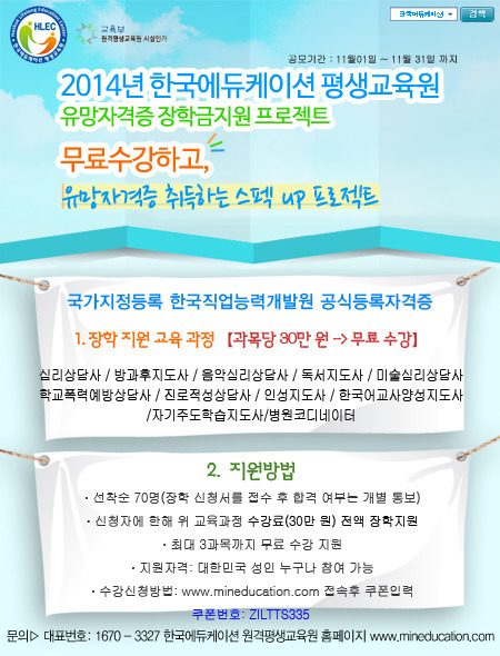 - 유망 자격증 교육문화를 선도하는 한국에듀케이션 원격 평생교육원에서는 최근 복지와 심리적 치유에 대한 관심이 높아지면서 미래 유망 직종으로 상담, 교육,복지 분야가 각광받고 있는 유망자격증에 대해 전문 인력의 활성화와 체계적인 전문자격증 과정을 무상제공 및 장학혜택을 드리고자 합니다.