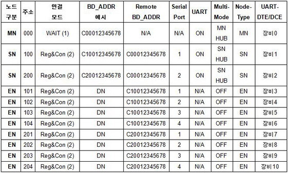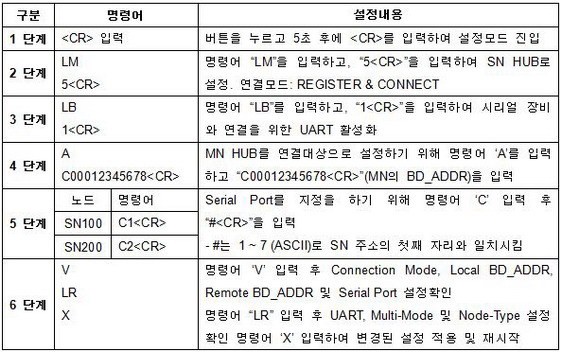 1 단계: MN HUB를 Multimode 명령어를 이용하여 설정하고 시리얼장비0과 연결을 위해 UART를 활성화합니다. SN들을 위한 MN의 BD_ADDR을 획득합니다.
