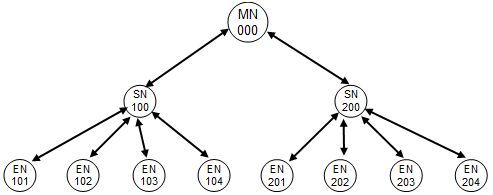 1대10 Point-to-Multipoint HUB 네트워크 구성 예로 마스터 장비에 연결 및 주 라우터 기능의 MN HUB, 슬레이브 장비에 연결 및 부 라우터 기능의 SN HUB 2개 및 8개의 슬레이브 장비에 연결된 EN101 ~ EN104 및 EN201 ~ EN204로 구성됩니다. 구성방법에는 수동구성과 자동구성으로 이루어지며, 여기서는 수동구성에 대하여 예로 듭니다.