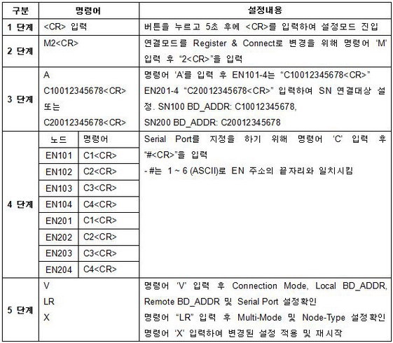 주) Reg&Con: REGISTER&CONNECT, DN: Don’t need, N/A: Not Applicable, UART-DTE/DCE: 시리얼 장비와 연결 가능여부, MN은 멀티모드 명령어에 의해 자동으로 연결모드가 결정됨.