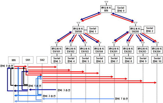 - 시리얼 장비1의 송신 데이터 예: SN100 HUB에서 MN HUB 및 EN101~104에 전달 후 장비3~6에 전송. MN HUB에서 장비0과 SN200 HUB에 전달. SN200 HUB에서 장비2에 전송 및 EN201~204에 전달하여 장비7~10에 전송.