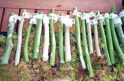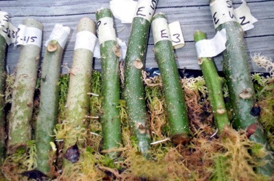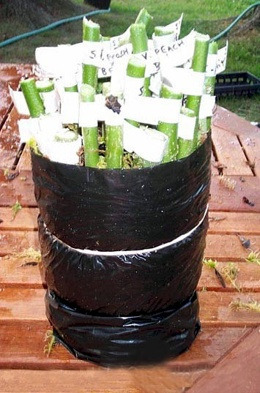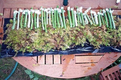① 검은 비닐봉지를 직사각형 모양으로 2~3겹 펼친다. 그위에 축축한 물이끼(물에 적신 수태)를 두껍게 깔아준다. 그리고 일정한 간격으로 잘라놓은 가지들을 배열한다. 물론 가지들은 종류가 다를 경우 이름을 적어서 붙여둔다. |