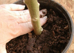 구멍에 삽목가지를 두세마디쯤 꽂은 다음 주변의 흙을 살살 눌러 고정시킨다.