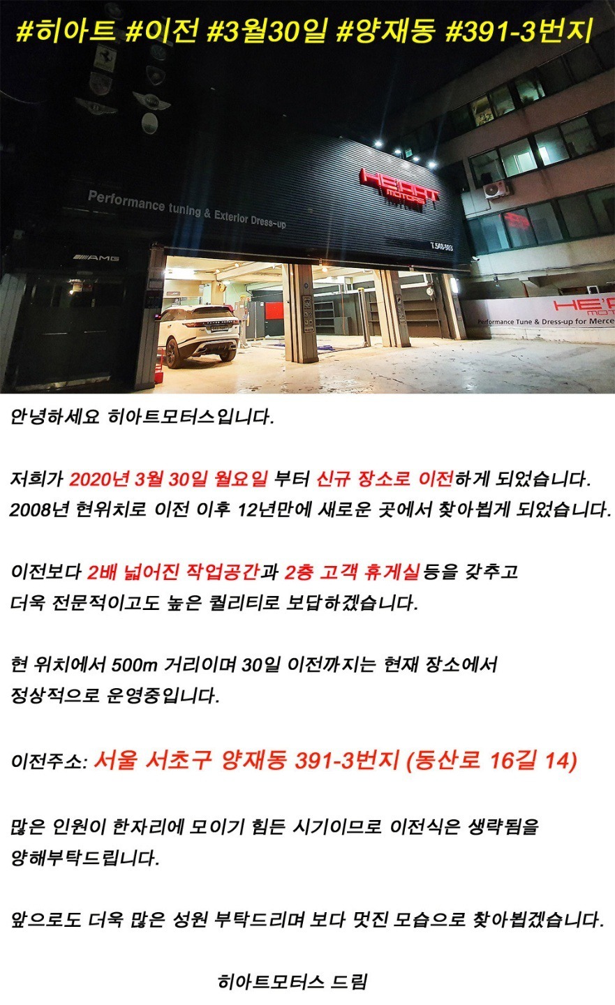 히아트 모터스 새 위치: 서울 서초구 양재동 391-3번지 (동산로 16길 14)