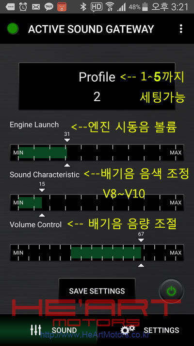 배기음은 총 5가지 프리셋을 사운드게이트 앱 상에서 미리 지정해두고 앱에서