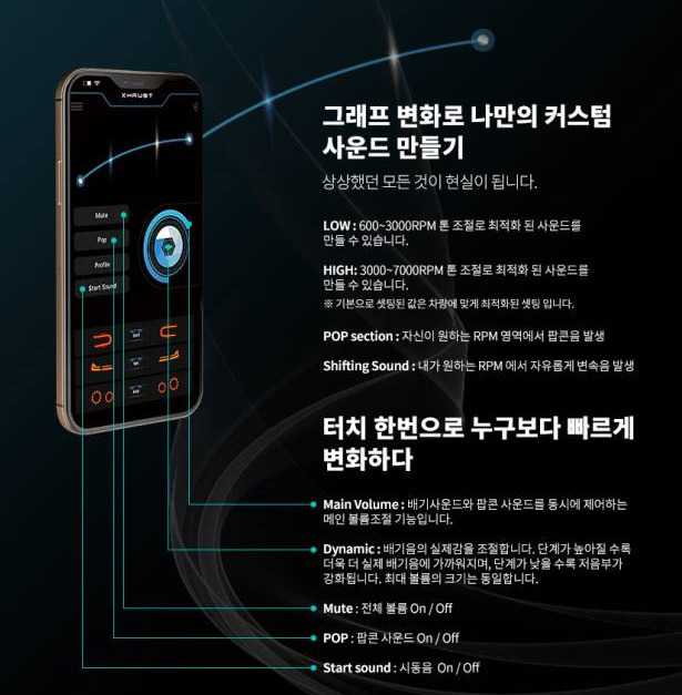 전용앱을 통한 32가지 슈퍼카 사운드 배기음 세팅이 가능합니다.