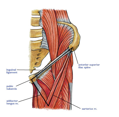 봉공근(sartorius)과 서혜인대(inguinal ligament)가 붙는 것을 볼 수 있습니다.