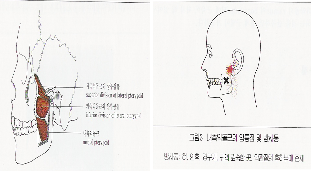 제 4 장 내측익돌근(medial pterygoid) 작성자이화범|작성시간09.06.03|조회수129 목록 댓글 0 글자크기 작게가 글자크기 크게가 •인두의 통증,연화곤란및 입을 벌릴때에 중등도의 저항과 통증 유발 •한쪽만 수축하면 턱은 반대쪽으로 이동 •단독으로 문제 발생하지 않음 •다른 저작근보다 압통 덜 유발 다음검색 현재 게시글 추가 기능 열기 북마크 공유하기 신고 센터로 신고 댓글 댓글 0 댓글쓰기 답글쓰기 댓글 리스트