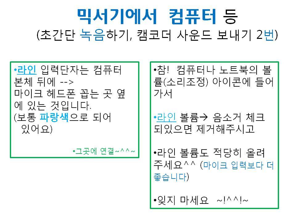 *(녹음 끝나고 주의사항^^) 컴퓨터로 녹음된것을 믹서기 앰프로 연결된채 --> 재생(플레이)할때는 반드시 녹음용 라인입력에 음소거(음차단)하시거나
