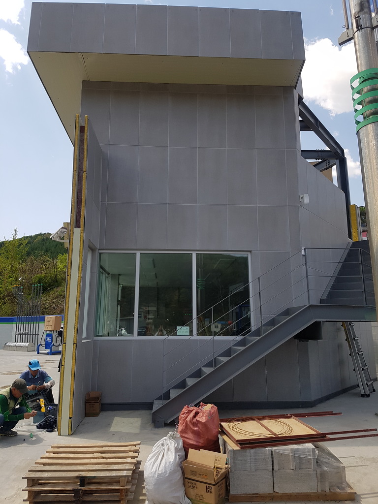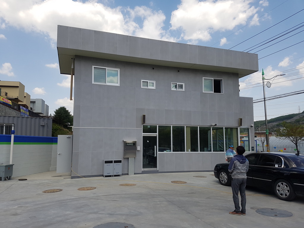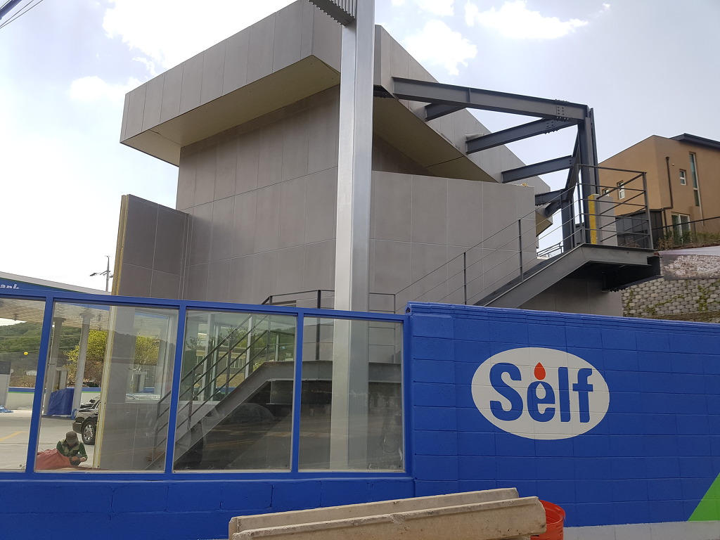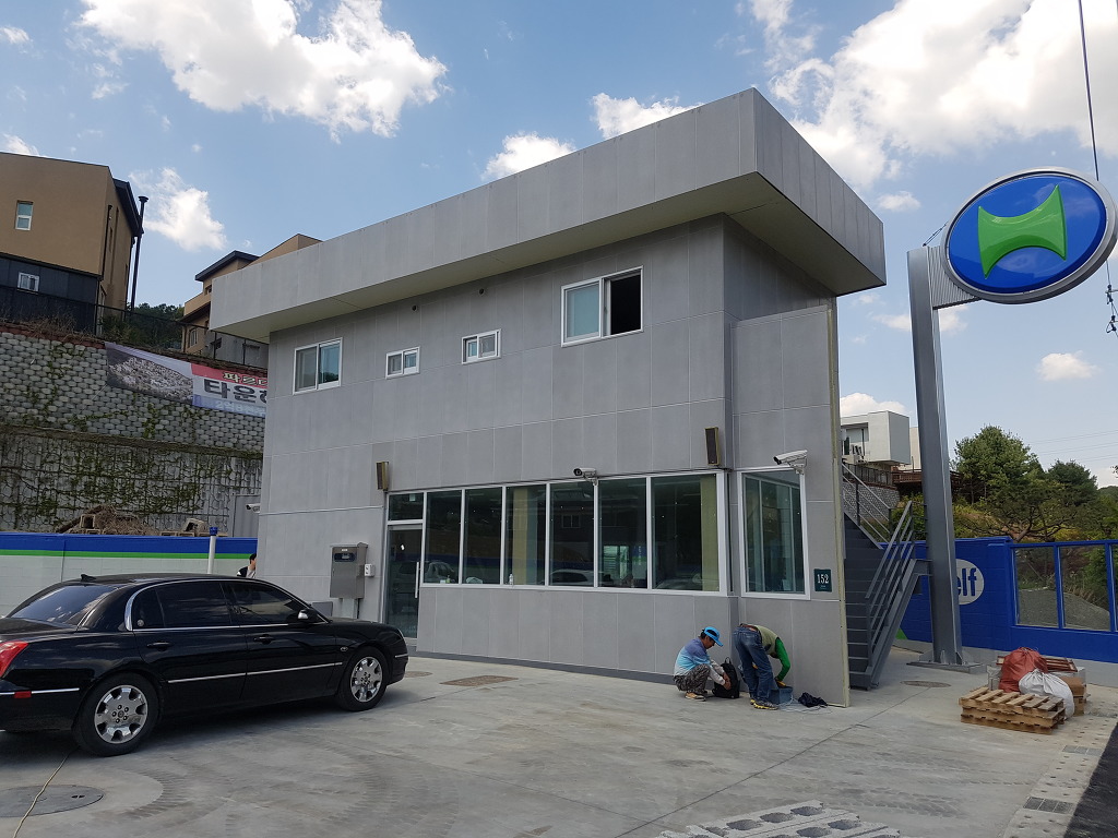 주유소라고 얘기 하지 않으면 미술관이라고 해도 믿으실 것 같은데요? 이제 저상태에서 발수제만 표면에 바르면 시공이 끝나는데요. 외장재에는 발수제는 필수입니다. 이제 조금 있으면 장마철이죠?