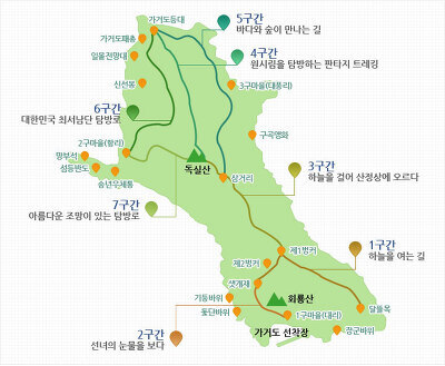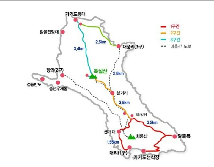 대리마을(1구)~샛개재~방공호~독실산~향리마을(2구)~섬등반도~대리마을/(4시간 30분)