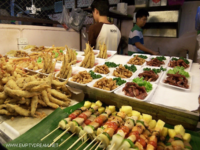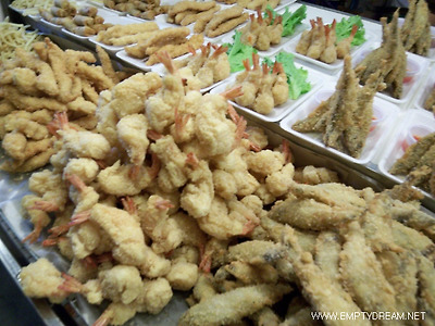새우튀김, 고추튀김도 있고, 여러가지 야채와 고기를 꽂은 꼬치구이도 있다. 새우튀김이 싸고 맛있다.