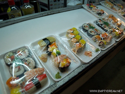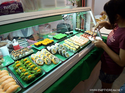 또다른 스시 가게. 손님이 직접 접시에 스시를 담으면, 주인이 눈으로 보고 일일이 가격을 계산한다. 스시는 몇 개 안 담아도 100밧이 훌쩍 넘어버려서 좀 부담이 되는 음식이다.