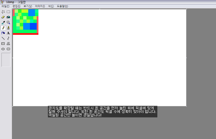 경고!!!: 큰지도를 확장할 때는 픽셀 수가 정확히 맞아야 하며 개발된 큰지도의 경우 절대 색칠된 공간만 늘이시면 안됩니다!