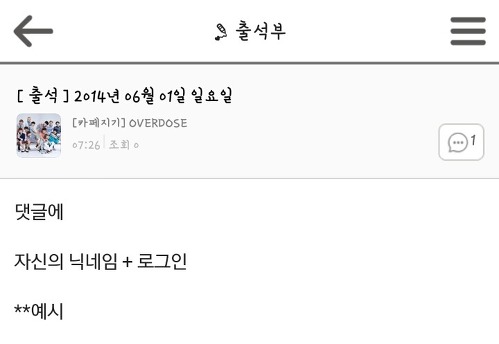 (지기가 하루에 한번씩 해당 날짜가 써져 있는 게시글을 올리면 댓글로 닉네임+로그인 이라는 댓을 달아주시면 됩니다.)
