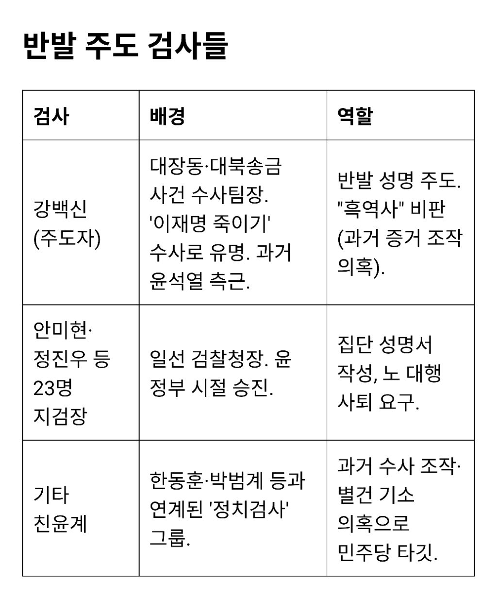 반발은 주로 '친윤계(윤석열 전 대통령 측근)' 검사들로부터 시작됐으며, 약 20~30명 규모로 추정됩니다. 이들은 과거 윤석열 정부 시절 승진·영전의 수혜자였으나, 이재명 정부 출범 후 '정치검사'로 낙인찍힌 인물들입니다. 주요 원인과 배경은 다음과 같습니다: