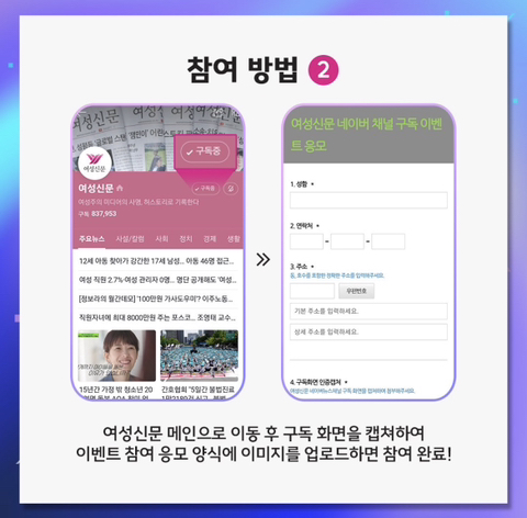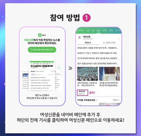• 참여방법: 네이버 뉴스에서 여성신문을 구독 설정하고 구독 중인 화면을 캡쳐 후 이벤트 양식 작성하기!