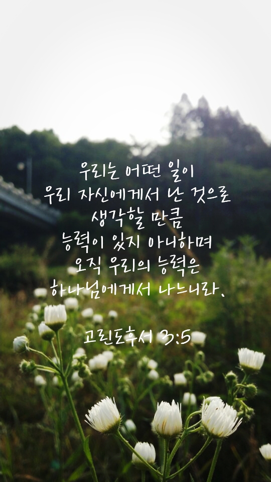 "우리가 무슨 일이든지 우리에게서 난 것 같이 스스로 만족할 것이 아니니 우리의 만족은 오직 하나님으로부터 나느니라" (고후 3:5)