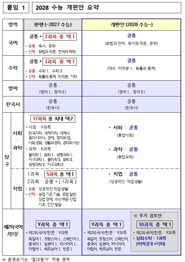 2028학년도(현 중학교 2학년생)부터 수능에서 외국어를 제외한 모든 영역에서 선택과목이 사라짐.