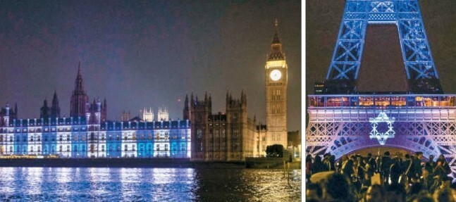 이스라엘 국기 장식한 英·佛 9일(현지시간) 영국 런던 국회의사당(왼쪽 사진)과 프랑스 파리 에펠탑에 이스라엘 국기 모양의 조명이 밝혀져 있다.