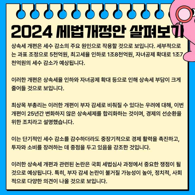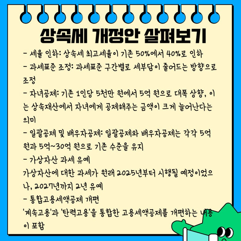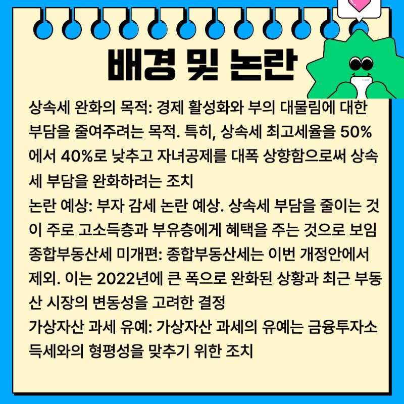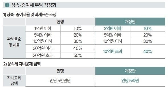 ②상속세 최고세율을 현행 30억 초과분에 대해 50%에서 10억원 초과분에 대해 40%로... 야당은 반대.(문화)