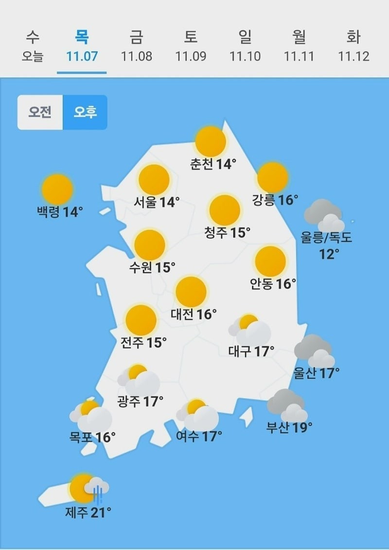→ 아침 최저기온은 3~8도, 낮 최고기온은 13~19도.
