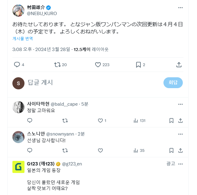 원펀맨 리메이크 248화 연재일 작성자미나리|작성시간24.03.28|조회수188 목록 댓글 0 글자크기 작게가 글자크기 크게가 기다리게 해서 죄송합니다. 이웃의 영점프판 원펀맨의 다음 갱신은 4월 4일(목) 예정입니다. 잘 부탁드립니다. 원펀맨 리메이크 248화 연재일 은 수정본 242화 일수도 다음검색 현재 게시글 추가 기능 열기 북마크 공유하기 신고 센터로 신고 댓글 댓글 0 댓글쓰기 답글쓰기 댓글 리스트