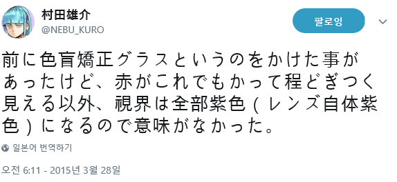 트위터 번역 : 전에 색맹 교정 안경이라는 것을 써본 적이 있었는데, 빨간 색이 엄청나게 진하게