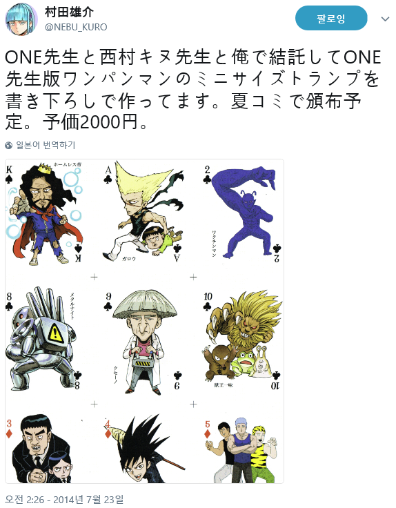 무라테 센세 트윗 번역 : ONE선생님과 니시무라 키누선생님과 제가 결탁해서 ONE선생님판 원펀맨의