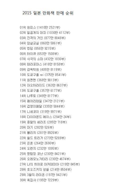 원펀맨 2015년 일본 만화책 판매순위 작성자카페에산다|작성시간16.05.17|조회수240 목록 댓글 1 글자크기 작게가 글자크기 크게가 원펀맨 2015년 일본 만화책 판매순위 11위.....올해는 원펀맨 판매순위 대거 증가 예상?재미없네 뭐네해도 원피스는 원피스 다음검색 현재 게시글 추가 기능 열기 북마크 공유하기 신고 센터로 신고 댓글 댓글 1 댓글쓰기 답글쓰기 댓글 리스트 작성자음속의 패닉 | 작성시간 16.08.09 나는 원피스가 언제까지 연재를 할건지 궁금합니다.나루토는 이미 완결이고, 코난은 올해 안에 끝나고, 헌터 헌터는 연재...를 해야겠죠? 댓글 전체보기