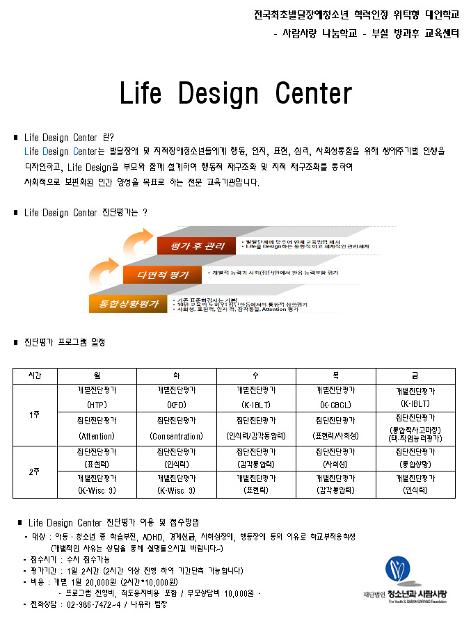 [사람사랑 나눔학교] Life Design Center 진단평가 안내문입니다. 작성자사람사랑나눔학교|작성시간11.04.15|조회수21 목록 댓글 0 글자크기 작게가 글자크기 크게가 다음검색 현재 게시글 추가 기능 열기 북마크 공유하기 신고 센터로 신고 댓글 댓글 0 댓글쓰기 답글쓰기 댓글 리스트