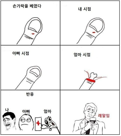 아이가 다쳤을때 가족들의 반응이라고 하네요 ㅋㅋㅋ 작성자냥이곰.|작성시간12.04.27|조회수60 목록 댓글 1 글자크기 작게가 글자크기 크게가 다음검색 현재 게시글 추가 기능 열기 북마크 공유하기 신고 센터로 신고 댓글 댓글 1 댓글쓰기 답글쓰기 댓글 리스트 작성자하늘정원 | 작성시간 12.10.16 ^^ 댓글 전체보기