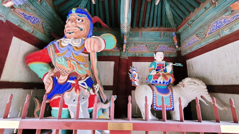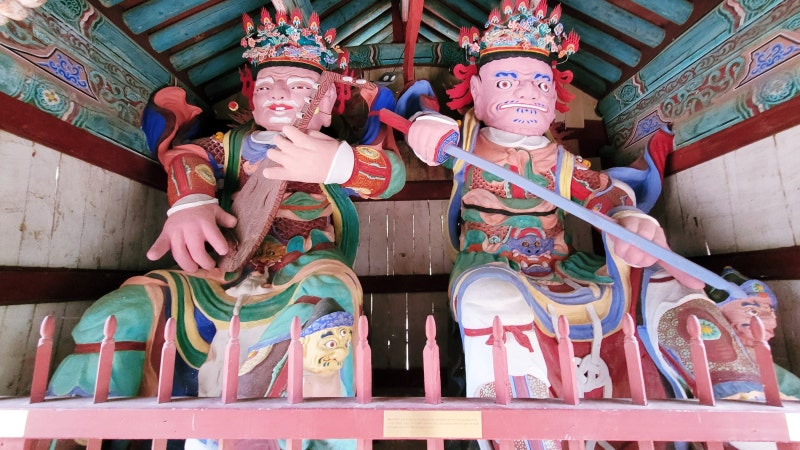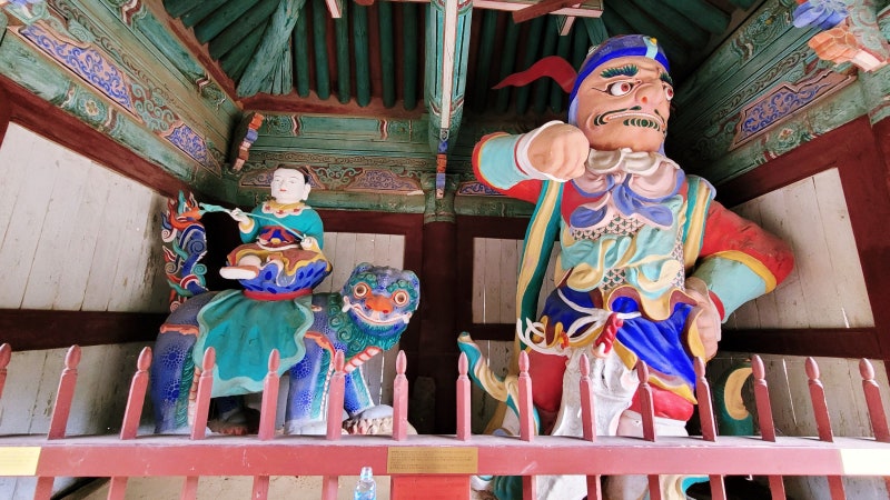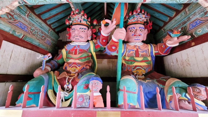 조선 후기 일반적인 사천왕상 배치의 경향대로 천왕문의 진입 우측 방향에 동방지국천왕과 북방다문천왕이, 천왕문의 진입 좌측 방향에 남방증장천왕과 서방광목천왕이 배치되어 있습니다. 약 4m에 이르는 크기로 나무로 골격을 만들고 그 위에 흙을 덧붙여 만들었는데 의자에 걸터앉은 모습입니다.