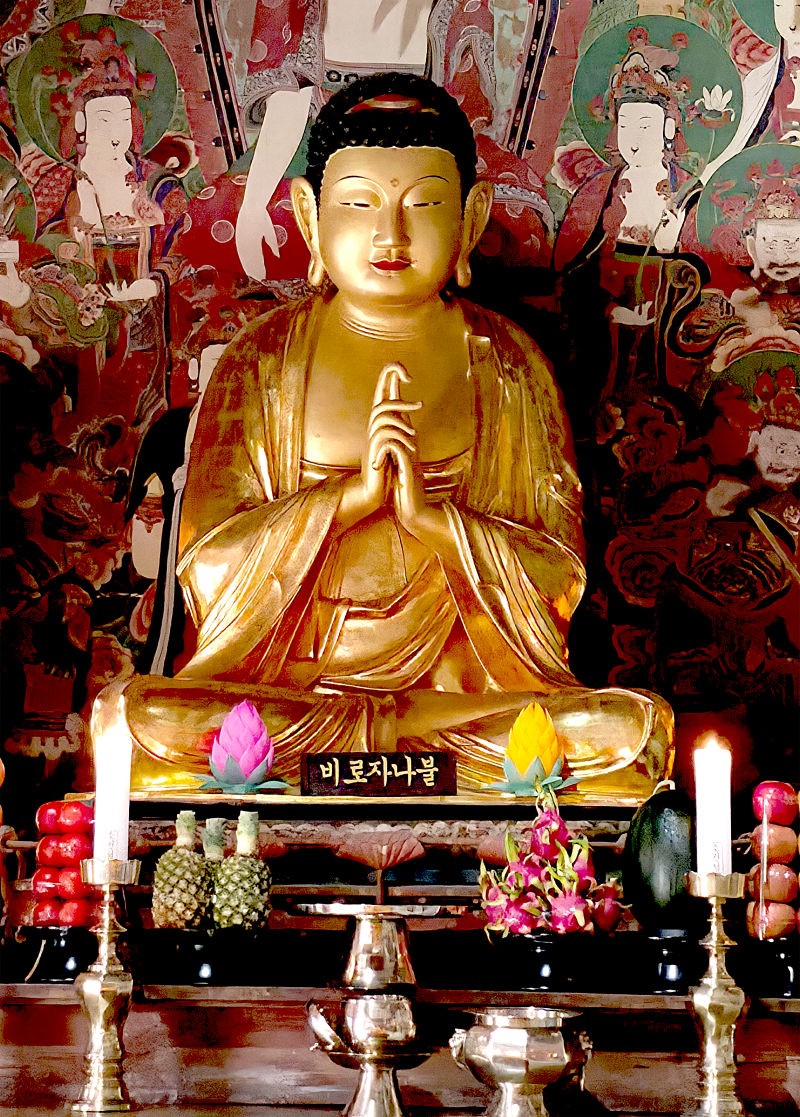 대광보전 건물 내부에는 진리를 상징하는 비로자나불이 지권인 수인을 하고 동쪽을 바라보도록 봉안되어 있습니다. 비로자나 부처님은 진리 자체를 상징하는 부처님으로 진리의 몸이 온누리에 두루 비치는 광명의 빛을 내어 모든 이들을 지혜의 길로 이끌어 주십니다ㆍ 건물이 설법을 하는 대법당의 기능을 위한 공간배치와 뒷쪽 대웅보전의 석가모니불과 방향이 중복되어 동쪽을 향했다고 추정됩니다.