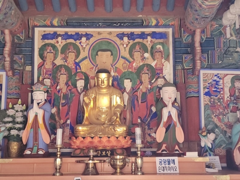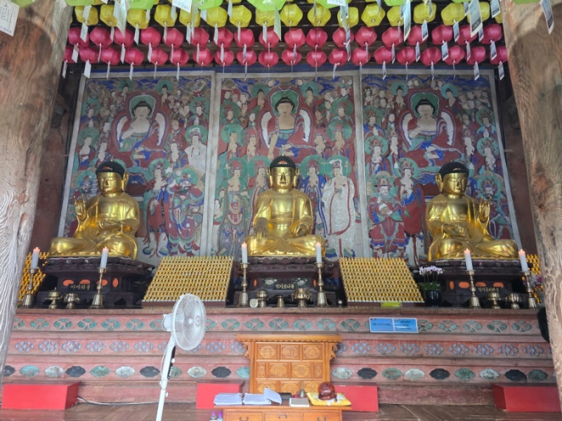 대웅보전에는 주불로 가운데에 현세불인 석가모니불, 오른쪽(좌협시)에 과거불인 약사불, 왼쪽(우협시)에 미래불인 아미타불이 모셔져 있습니다.