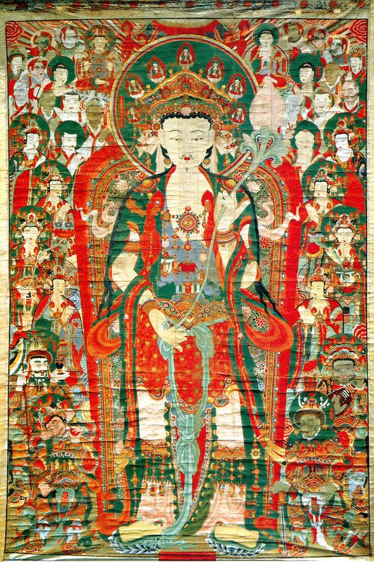 석가모니불을 좌우에서 협시하고 있는 제화갈라보살을 비롯한 6대 보살은 관음·대세지·문수·보현보살로 구성되었으며 10대 제자상과 보향·명월천자가 상단 좌우 끝에 그리고 아수라 가루라 용왕들이 배치되어 있습니다. 남아 있는 글로 보아 시주자를 비롯한 여러 승려와 일반인들이 제작에 참여하였으며 석가탄신일 외에도 수륙재와 49재에 쓰였던 그림임을 알 수 있습니다.