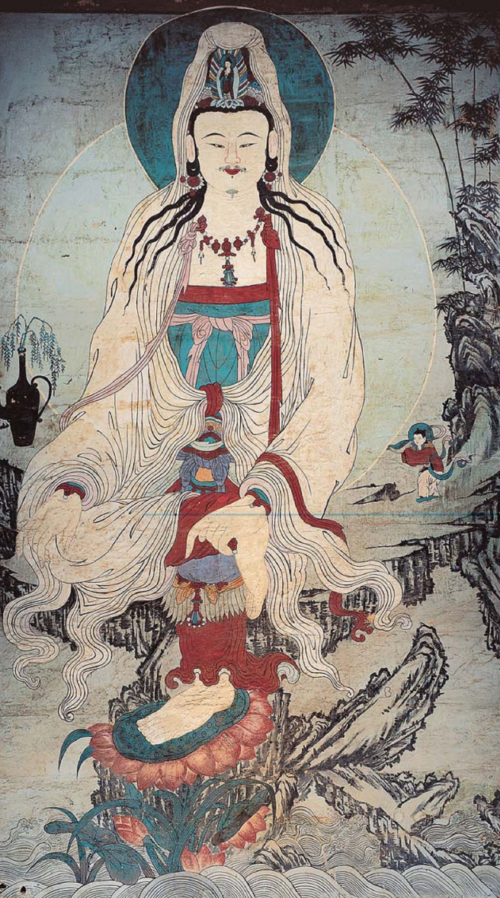 양손은 반가좌한 오른쪽 다리위에 자연스럽게 놀려놓았고, 맨발인 상태의 왼쪽 발은 홍련의 청록색 연밥을 밟고 있습니다. 옷자락 사이로 빠져나온 긴 머리칼이 양쪽으로 3갈래씩 드리워져 있으며, 입상의 화불이 표현된 보관을 쓰고 목에는 영락으로 장식하였습니다. 옷자락의 주름을 비롯하여 연꽃의 꽃잎 하나하나에 이르기까지 매우 섬세하게 그렸습니다.또한 보살의 양쪽 반석 위에는 관음보살을 향해 청조(靑鳥)를 받치듯 합장 배례하는 남순동자(선재동자)가 화면 우측에 버들가지가 꽃힌 흑색의 정병이 좌측에 묘사되어 있습니다.