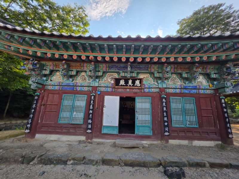 응진전은 철종 3년(1852)에 새로 보수한 것으로 앞면 3칸·옆면 2칸 규모이며, 지붕은 옆면에서 볼 때 여덟 팔(八)자 모양인 팔작지붕으로 꾸몄습니다. 지붕 처마를 받치기 위해 장식하여 만든 공포는 기둥 위와 기둥 사이에도 있는 다포 양식으로 짜올렸습니다.