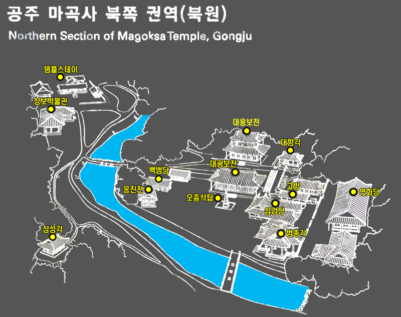 마곡사는 마곡천을 기준으로 남원과 북원으로 나뉜니다ㆍ