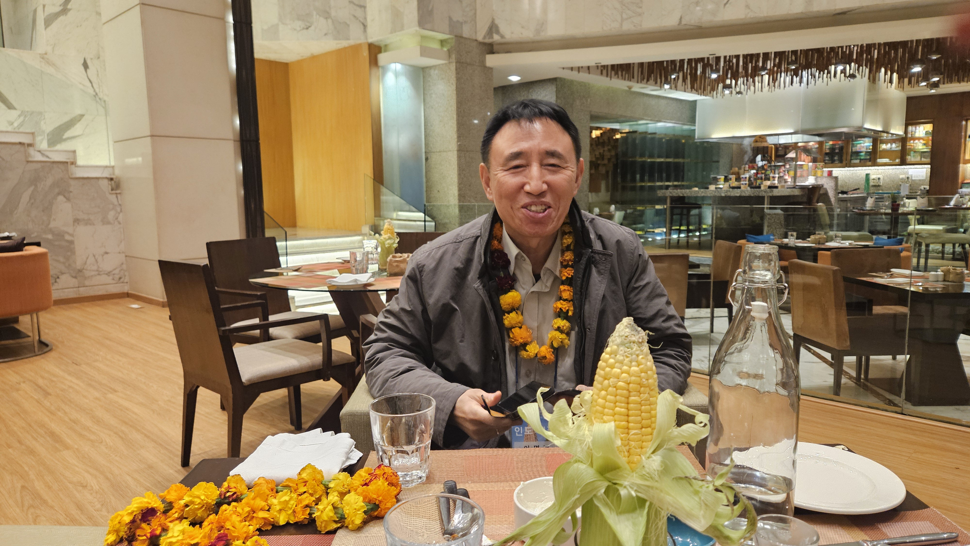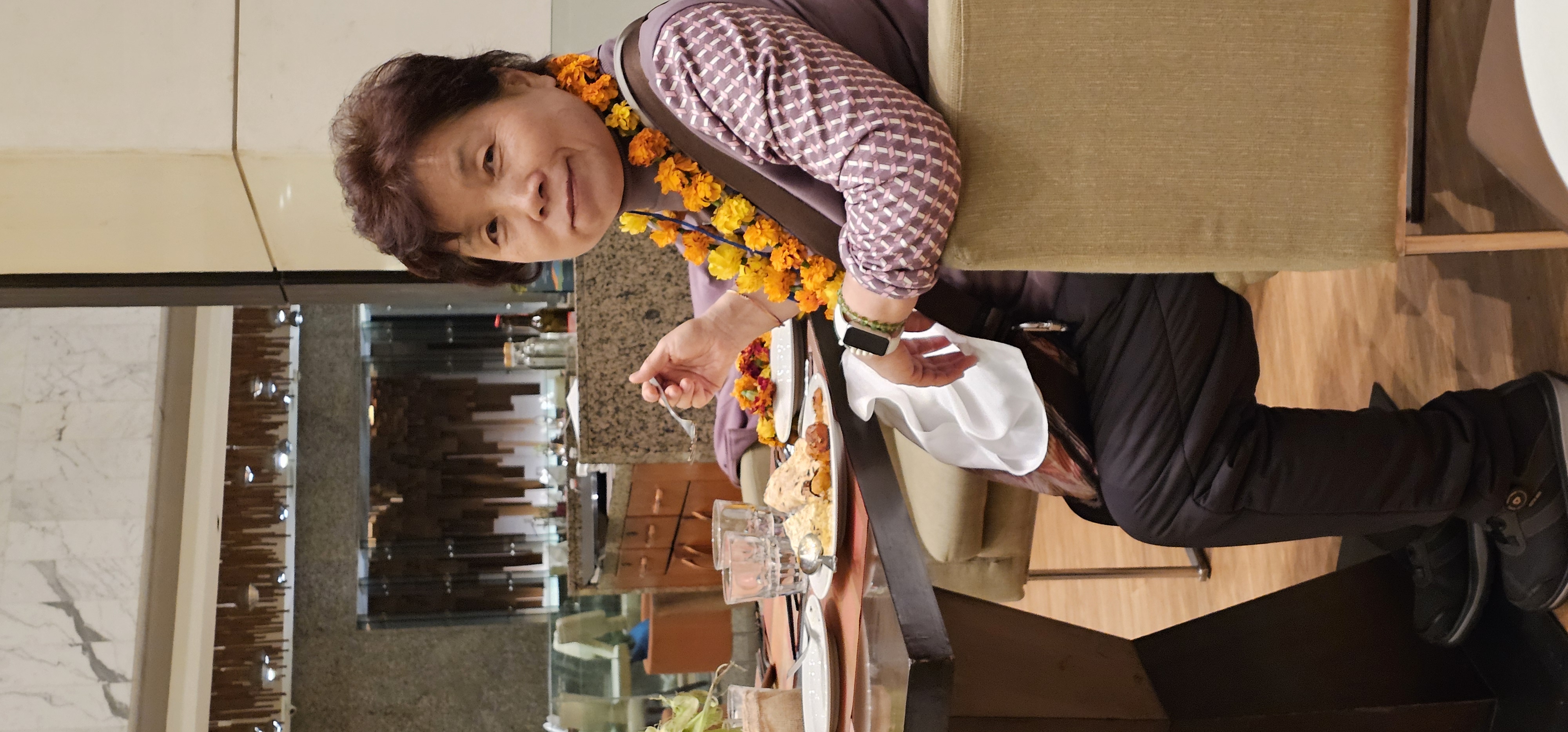 걑은 6기 이명래 포교사님 목에 <더 그랜드 뉴델리> 호텔 입구에서 환영의 뜻으로 걸어 준