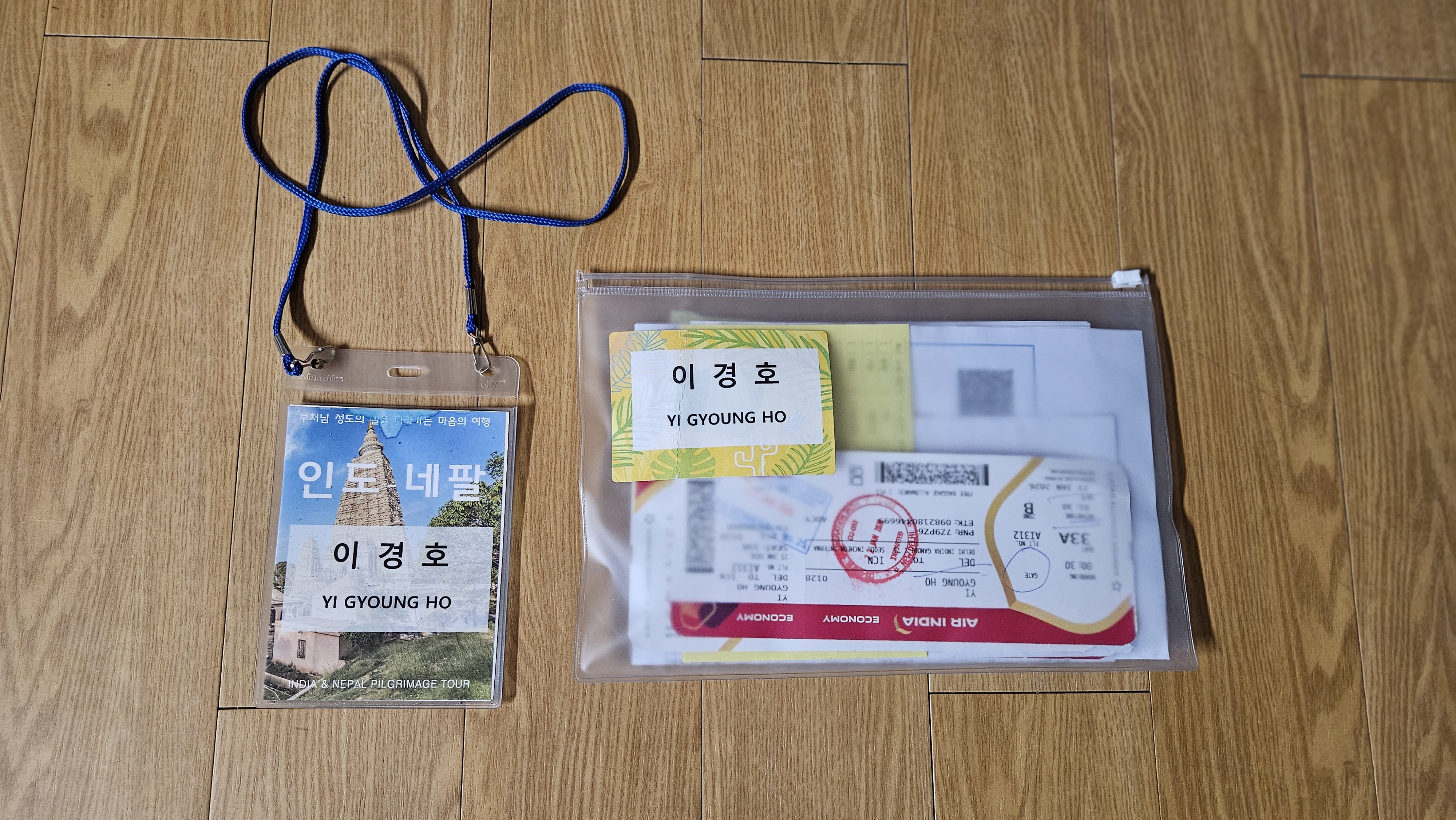 명찰과 보험 서류, 인도비자, 항공권, 인도입국증, 수하물 가방에 달 Tag, 여행일정..등