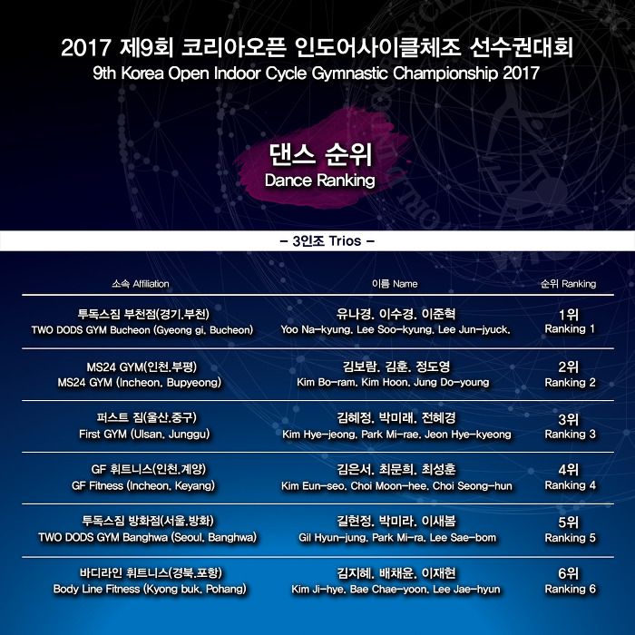 9th KOREA OPEN INDOORCYCLE GYMNASTIC CHAMPIONSHP 2017 (Dance.Trios) | ||||