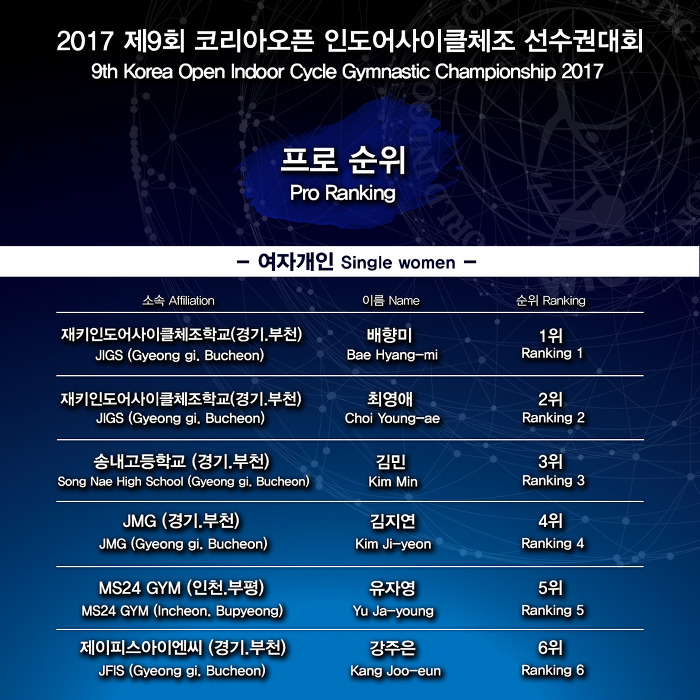 9th KOREA OPEN INDOORCYCLE GYMNASTIC CHAMPIONSHP 2017 (Pro Gymnastics. Single women) | ||||