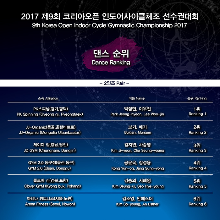 9th KOREA OPEN INDOORCYCLE GYMNASTIC CHAMPIONSHP 2017 (Dance.Pair) | ||||