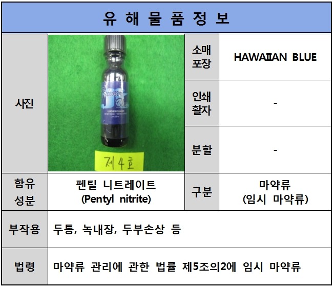 [마약류]펜틸 니트레이트(Pentyl nitrite)(HAWAIIAN BLUE/-/액상/-/미황색/-) 작성자이재원|작성시간14.10.30|조회수134 목록 댓글 0 글자크기 작게가 글자크기 크게가 다음검색 현재 게시글 추가 기능 열기 북마크 공유하기 신고 센터로 신고 댓글 댓글 0 댓글쓰기 댓글 리스트
