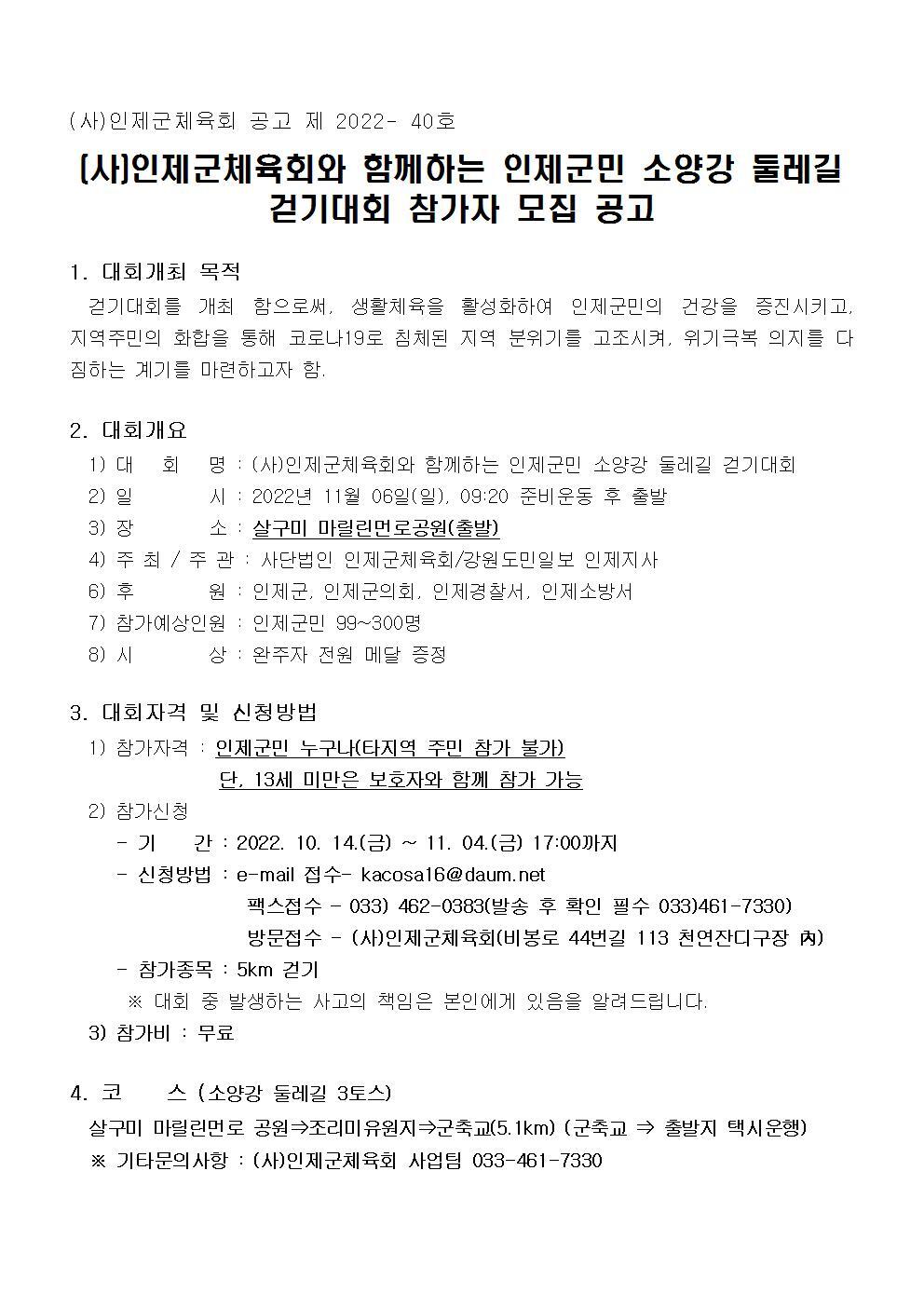 (사)인제군체육회와 함께하는 인제군민 소양강 둘레길 걷기대회 참가자 모집 안내 작성자이종찬|작성시간22.10.14|조회수136 목록 댓글 0 글자크기 작게가 글자크기 크게가 참가신청서.hwp16.00KB 첨부파일첨부된 파일이 3개 있습니다. jpg 파일 모집공고001.jpg 다운로드 jpg 파일 모집공고002.jpg 다운로드 hwp 파일 참가신청서.hwp 다운로드 다음검색 현재 게시글 추가 기능 열기 북마크 공유하기 신고 센터로 신고 댓글 댓글 0 댓글쓰기 답글쓰기 댓글 리스트
