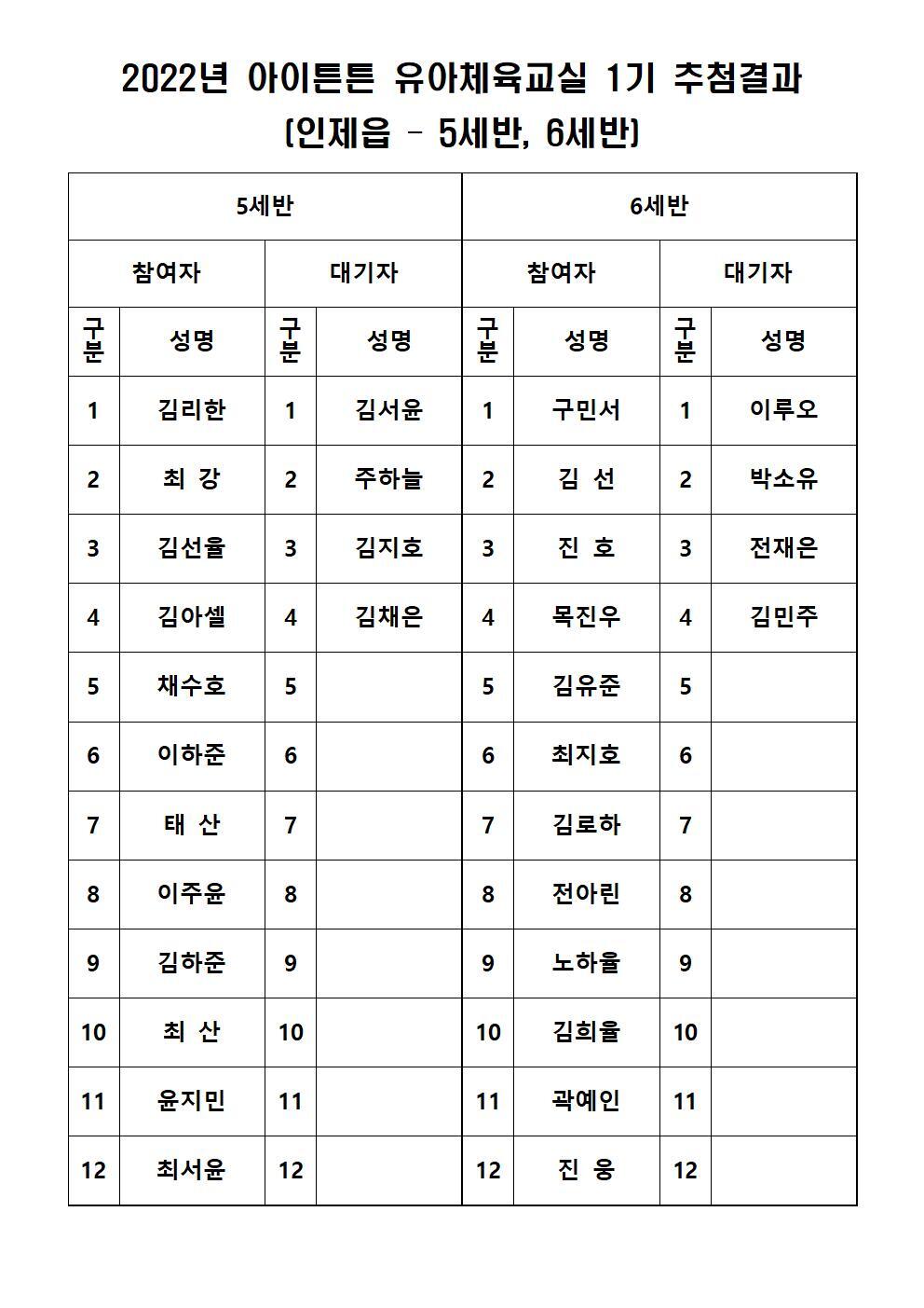 인제 5세반과 6세반은 각 16명 접수되어 12명 선정, 4명 대기자 추첨하였습니다.