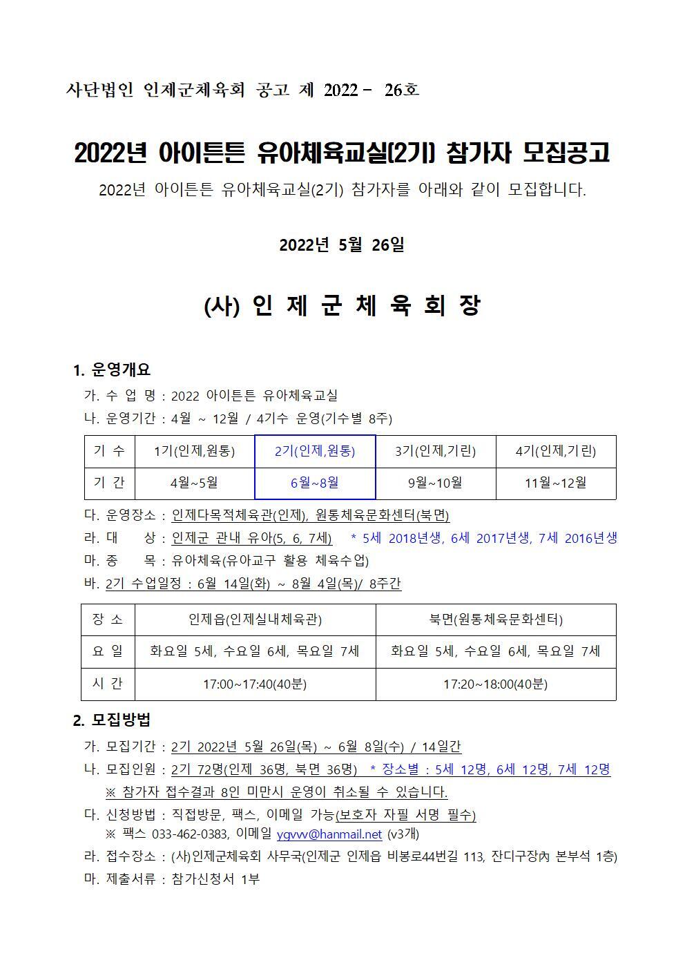2022년 아이튼튼 유아체육교실 2기(인제,원통) 참가자 모집공고 작성자김찬수(야구,유아체육지도자)|작성시간22.05.26|조회수203 목록 댓글 0 글자크기 작게가 글자크기 크게가 2022 아이튼튼 유아체육교실 2기 참가신청서(붙임1).hwp16.50KB 첨부파일첨부된 파일이 4개 있습니다. jpg 파일 2022 아이튼튼 유아체육교실 회원모집공고(2기)001.jpg 다운로드 jpg 파일 2022 아이튼튼 유아체육교실 회원모집공고(2기)002.jpg 다운로드 jpg 파일 2022 아이튼튼 유아체육교실 2기 참가신청서(붙임1)001.jpg 다운로드 hwp 파일 2022 아이튼튼 유아체육교실 2기 참가신청서(붙임1).hwp 다운로드 다음검색 현재 게시글 추가 기능 열기 북마크 공유하기 신고 센터로 신고 댓글 댓글 0 댓글쓰기 답글쓰기 댓글 리스트
