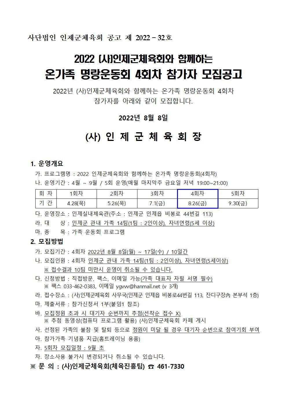 2022 인제군체육회와 함께하는 온가족 명랑운동회 4회차 참가가족모집 작성자김찬수(야구,유아체육지도자)|작성시간22.08.08|조회수144 목록 댓글 0 글자크기 작게가 글자크기 크게가 2022 온가족 명랑운동회 참가신청서(붙임1).hwp29.50KB 첨부파일첨부된 파일이 3개 있습니다. jpg 파일 2022 온가족 명랑체육대회 참가자 모집공고(4회차)002.jpg 다운로드 hwp 파일 2022 온가족 명랑운동회 참가신청서(붙임1).hwp 다운로드 jpg 파일 2022 온가족 명랑체육대회 참가자 모집공고(4회차)001.jpg 다운로드 다음검색 현재 게시글 추가 기능 열기 북마크 공유하기 신고 센터로 신고 댓글 댓글 0 댓글쓰기 답글쓰기 댓글 리스트