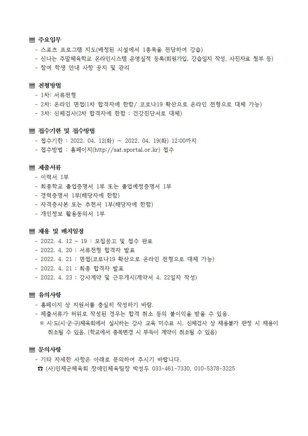 2022년 신나는 주말체육학교 강사 채용 작성자박성두|작성시간22.04.12|조회수191 목록 댓글 0 글자크기 작게가 글자크기 크게가 이력서, 개인정보활용동의서 양식.hwp41.50KB 첨부파일첨부된 파일이 3개 있습니다. jpg 파일 C:\Users\SAMSUNG\Desktop\장애인체육팀\신나는주말체육학교\2022\강사채용\채용\2022 신나는 주말체육학교 강사채용공고001.jpg 다운로드 jpg 파일 C:\Users\SAMSUNG\Desktop\장애인체육팀\신나는주말체육학교\2022\강사채용\채용\2022 신나는 주말체육학교 강사채용공고002.jpg 다운로드 hwp 파일 C:\Users\SAMSUNG\Desktop\장애인체육팀\신나는주말체육학교\2022\강사채용\채용\이력서, 개인정보활용동의서 양식.hwp 다운로드 다음검색 현재 게시글 추가 기능 열기 북마크 공유하기 신고 센터로 신고 댓글 댓글 0 댓글쓰기 답글쓰기 댓글 리스트